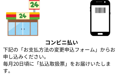 - 下記のフォームからお申し込みください。毎月20日頃に「払込取扱票」をお届けします。「コンビニでの現金支払い」か「スマホ決済アプリでの支払い」が可能です。ご利用いただけるスマホ決済アプリはPayPay、auPAY、楽天銀行です。