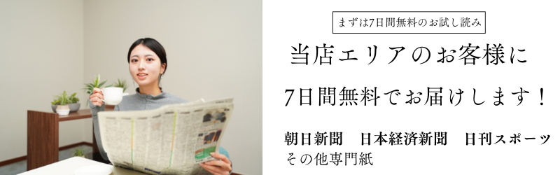 - 朝日新聞と日本経済新聞は朝刊と夕刊が発行されていますが、お試し読みのお届けは朝刊のみになります。